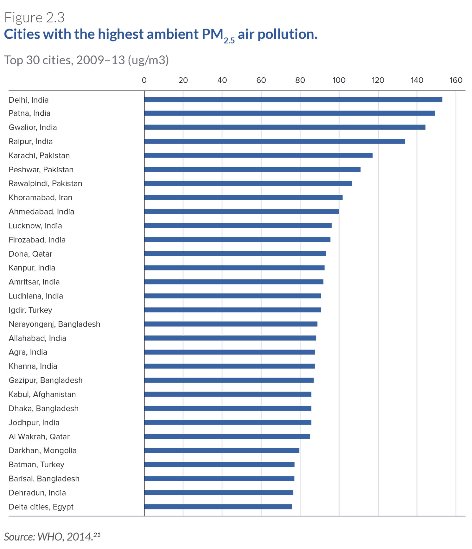 Cities with the highest ambient PM2.5 air pollution.